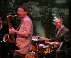 My drums are set up similarly to Mr. Wilson’s. They are roughly the same size, and speak with many of the same voices. I’m also supporting a piano trio, but the music is as different from Zeitlin’s group as is this room from Dizzy’s. The group is slogging through a stuttering version of a recent top 40 cover, the title of which I can’t remember. I’m striking the edge of the edge of a large cymbal with the shoulder of my stick in an effort to fill up some of the space occupied by other musicians in the songs original recording. The shuttering, flapping edge of the cymbal is splashing colored light around the room, spilling bits of blue, purple and red on the few faces staring back at us. There is a woman standing by the side of the stage, nearly close enough for me to reach out and touch, looking down, whirling her drink and staring at the glass.