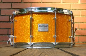 When I picked the drum up from Mike near his Charlotte, NC based shop, I was immediately struck by the dynamic, almost animated orange glass glitter finish, which really came alive in the sun light. The slim tube lugs and extra shell real estate really gave the wrap room to shine, producing an equally elegant yet extravagant look. The appearance received a lot of compliments from fellow musicians, and looked surprisingly nice against my walnut-stained drums (that said, this kind of finish would be particularly effective against a drum set finished in high-gloss black or white).