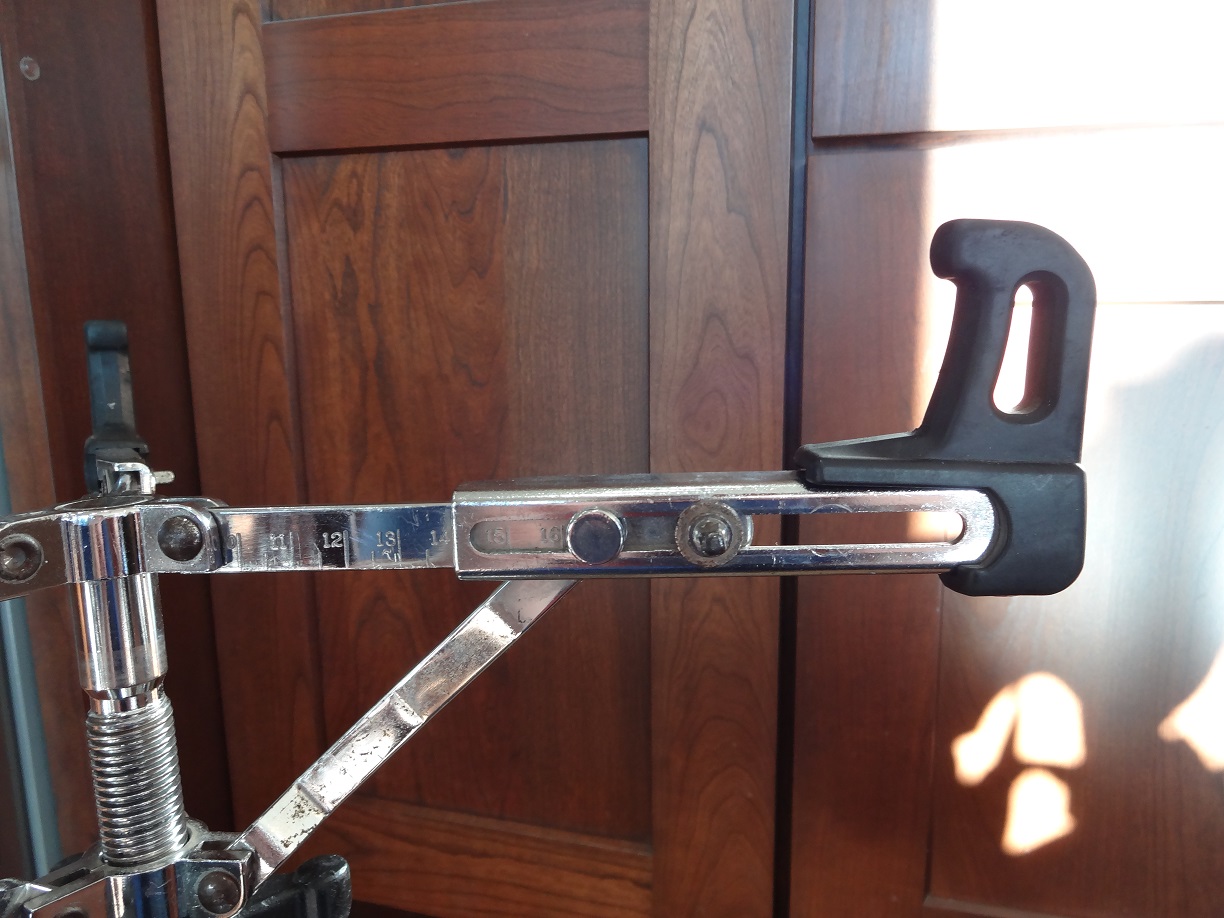 The centerpiece of the S-2000 is the adjustable snare basket. Each of the three basket arms is on a sliding track with marked indicators for snare drums sized from 10-16”. The tracks lock in place with a simple drum key bolt, and hold tight with no trouble. Even after so many years of use (this is the only snare stand I’ve used for rehearsals and shows since buying it), the arms move smoothly and rarely slip out of position.